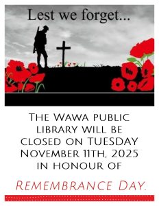 Lest we Forget. Wawa Public Library will be closed November 11 2025. hours / Wawa Public Library Lest we Forget. Wawa Public Library will be closed November 11 2025. Read More »