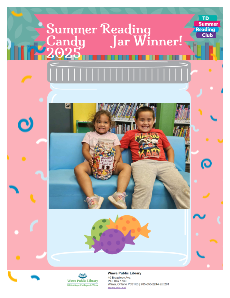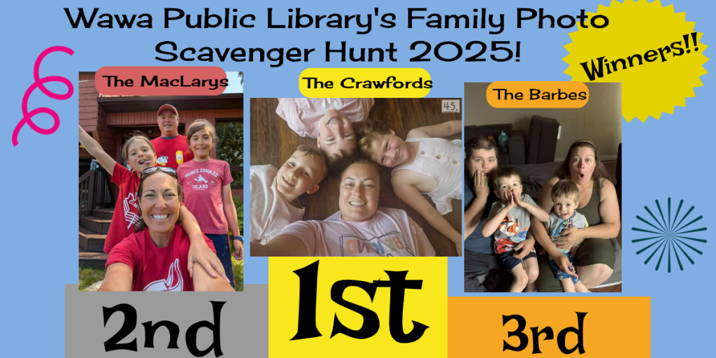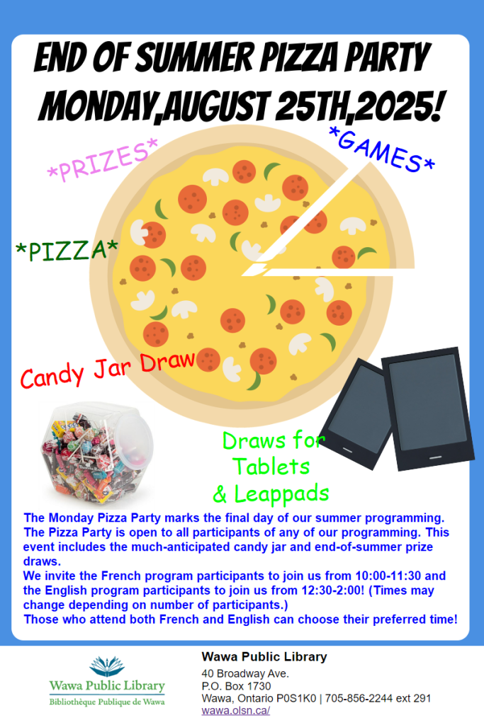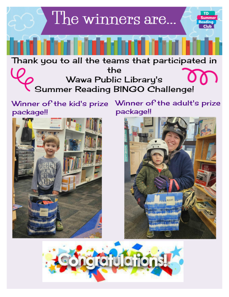 WAWA PUBLIC LIBRARY BINGO READING SUMMER CHALLENGE! Complete 15 squares of the BINGO card and then enter your name for a draw at the end of the summer. There will be one (1) adult prize and one (1) children prize. BINGO cards can be picked up at the library or downloaded from our website at wawa.olsn.ca under the Clubs page! Read with your kids, read outside, read in the car, read, read. BINGO cards must be returned to the library by August 23rd, 2025 at 2:00pm! Draw will be made on Monday, August 25th during the Pizza Party!